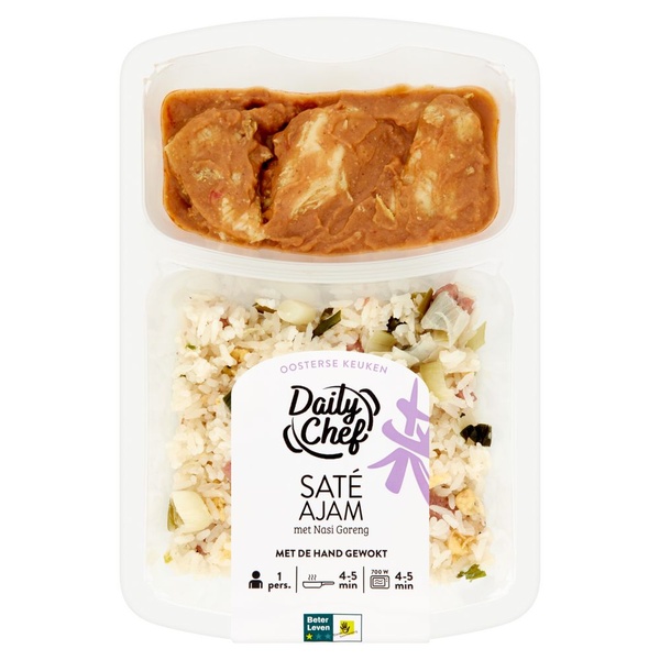 een kant-en-klare nasi goreng met gemarineerde stukjes kipfilet in zoetpittige pindasaus
