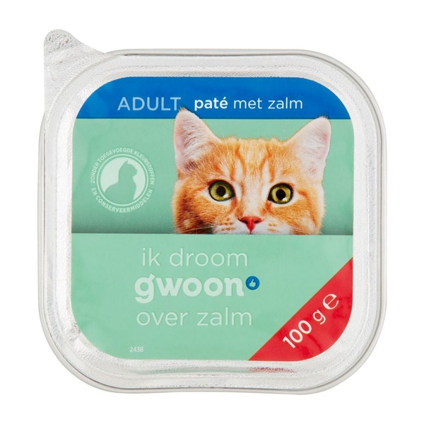g'woon kattenvoer voor de volwassen kat, paté met zalm