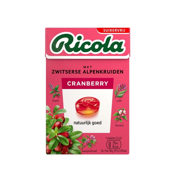 Ontdek Ricola cranberry keelpastilles, suikervrij genot in een doos