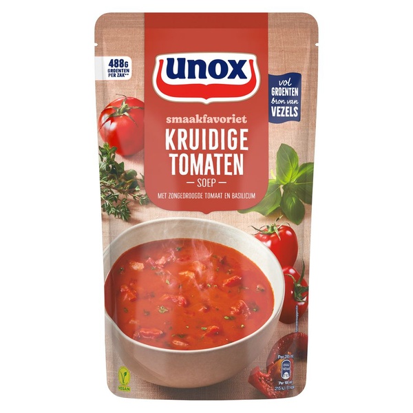 kruidige tomatensoep van Unox in een handige stazak